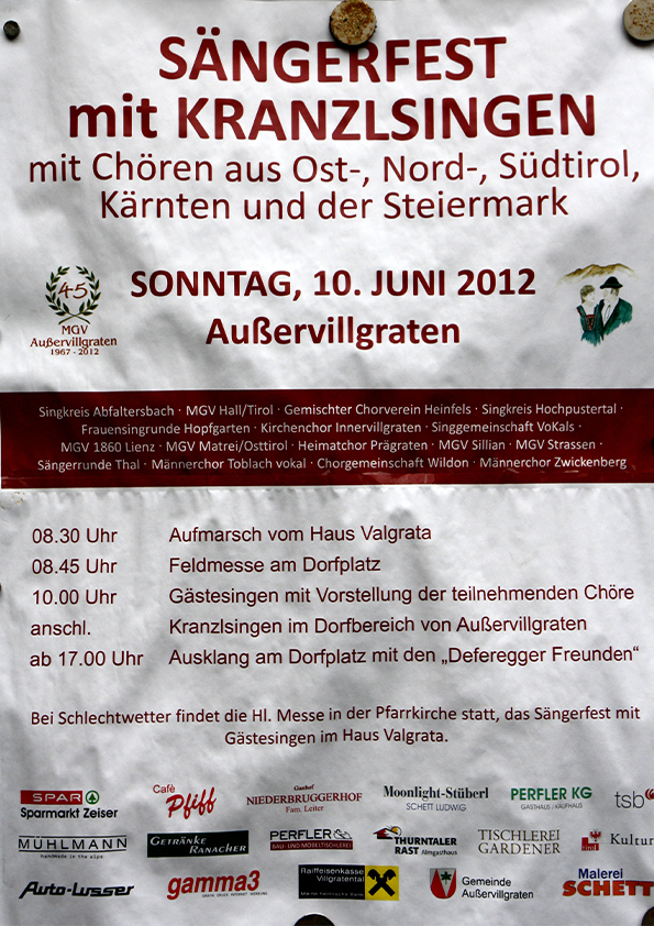 Reise nach Osttirol mit Besichtigung von Schloss Bruck, Stadtrundgang Lienz, Übernachtung in Obertilliach im Hotel Gasthof Unterwöger. Am Sonntag dann Auftritt beim Sängerfest in Außervillgratten und anschließend kleine Wanderung auf die Alm von Familie Perfler.