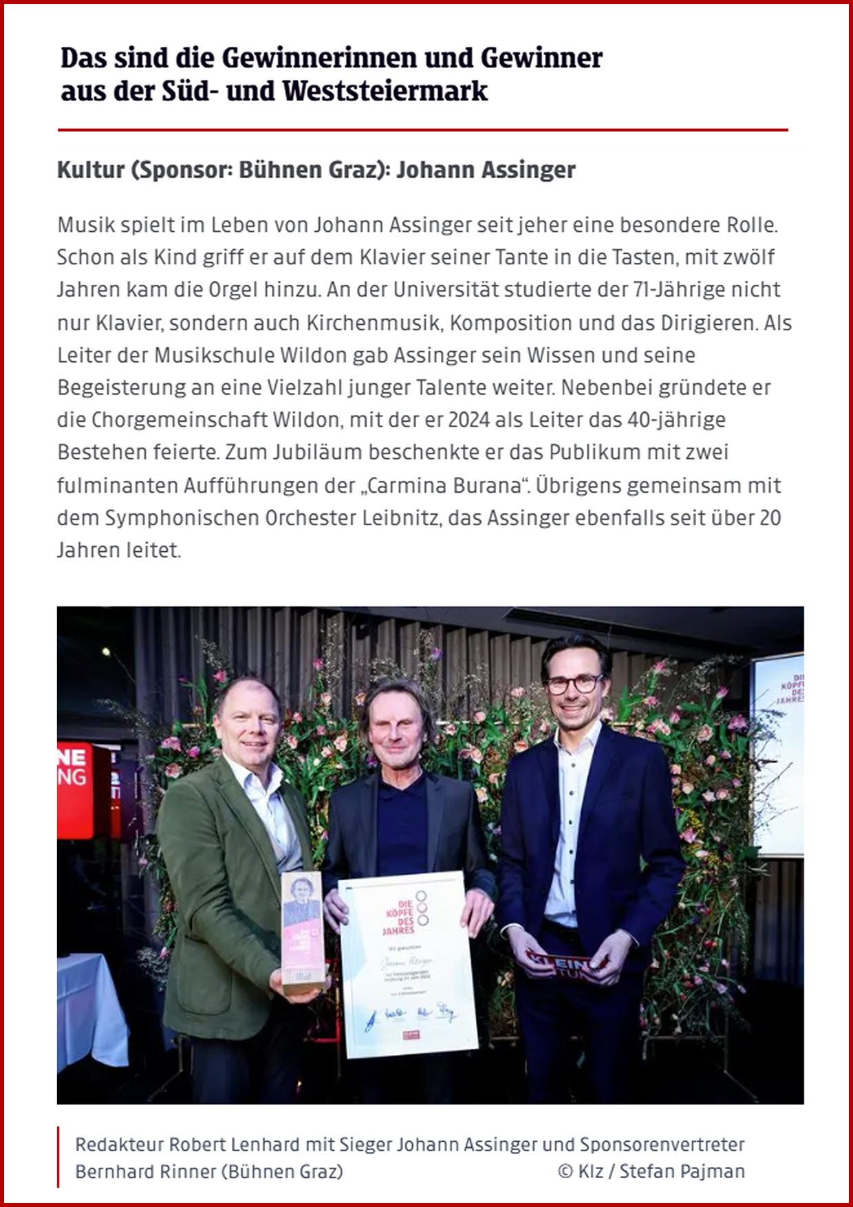 Am 06.02. wurden die Ehrungen der Köpfe des Jahres 2024 vergeben, und wir gratulieren Hans Assinger herzlich zum Sieg in der Kategorie Kultur Süd-/ und Weststeiermark (gesponsert von den Bühnen Graz)!